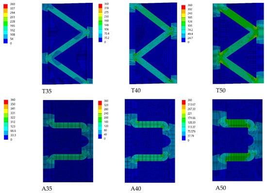 To study the effects of void area, filament width, and insulation on the thermal performance of 3DPC envelopes, all the lattice structures under this study were modeled to have the same thickness, height, nearly equal contour lengths and void, and insulation percentages. All contour lengths were measured along the center lines of the respective filaments as shown by red-dotted lines in Figure 6. By keeping the void area constant, the concrete area was increased by varying the filament width. This was completed using three nozzle sizes, i.e., 35 mm, 40 mm, and 50 mm, established from common industrial practice (Table 2). In the large-scale 3D printing of buildings, many companies, like Black Buffalo 3D, the first company to receive a building code compliance, at material, machine, and structural wall levels, use nozzle sizes of 1.38″–1.97″ (35–50 mm) []. For the 35 and 40 mm nozzles, the contour lengths, void, and insulation percentages are almost identical, while minor differences can be seen with the 50 mm nozzle size. Additionally, the T and A walls have very close void areas, while the P walls have a slightly lower void area. All walls are modeled to have an initial thickness of 12 in. (304.8 mm) but increased slightly due to an increase in filament width. Furthermore, a constant wall height of 500 mm is maintained in all cases. A detailed description of the parametric study is given in Table 2, where T35 means wall type one with a 35 mm nozzle size. The same analogy applies to naming all the subsequent walls.