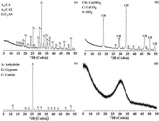 The CA-CS-SSC encompasses four principal constituents: slag, anhydrite, CA, and CS, wherein CA and CS function as alkali activators, and native anhydrite acts as the sulfate activator. Exhaustive information concerning the chemical compositions and mixing ratios of each component is presented in Table 1 and Table 2. The XRD patterns of the CA, CS, anhydrite, and slag are illustrated in Figure 1. The slags employed in this study predominantly comprise vitreous materials, with Figure 1d displaying the amorphous hump characteristic of slag. The specific surface area of the slag is a pivotal factor that determines its reactivity. In this investigation, the slag possessed a specific surface area of 425 m2/kg. The chemical composition of OPC, serving as the reference group for the CA-CS-SSC system, is cataloged in Table 1. The mineral constituents of CA, CS, and anhydrite are enumerated in Table 3.