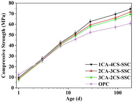 Figure 2. Compressive strength development of the CA-CS-SSC system mortars at 1, 3, 7, 14, 28, 90, and 180 days.