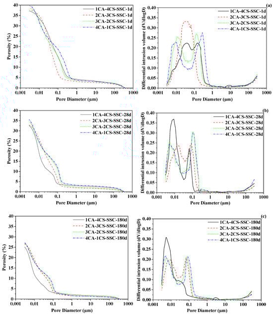 Figure 3. Porosity and differential intrusion curve of the CA-CS-SSC system pastes at (a) 1 day, (b) 28 days, and (c) 180 days.