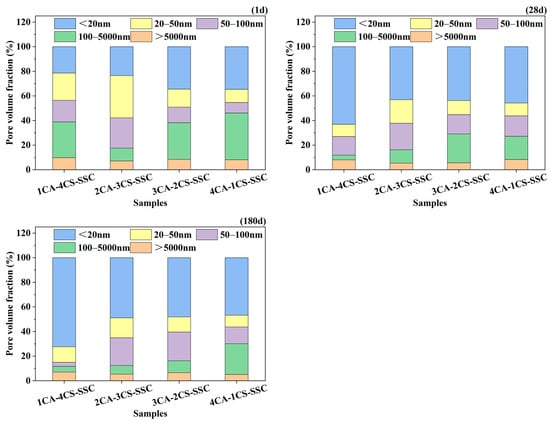 Figure 4. Pore volume fraction of the CA-CS-SSC system pastes at 1 day, 28 days, and 180 days.