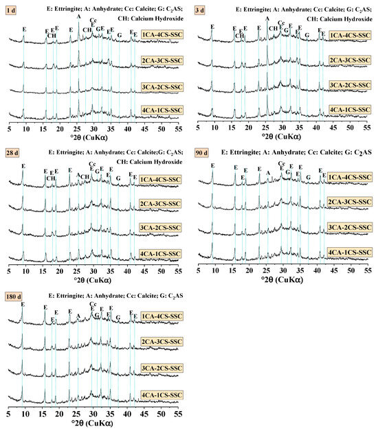 Figure 6. XRD patterns of the CA-CS-SSC system pastes at 1 day, 3 days, 28 days, 90 days, and 180 days.