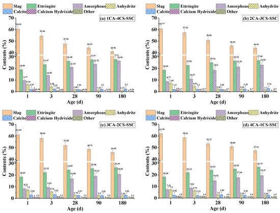 Figure 7. Phase evolution of (a) 1CA-4CS-SSC paste, (b) 2CA-3CS-SSC paste, (c) 3CA-2CS-SSC paste, and (d) 4CA-1CS-SSC paste for up to 180 days.
