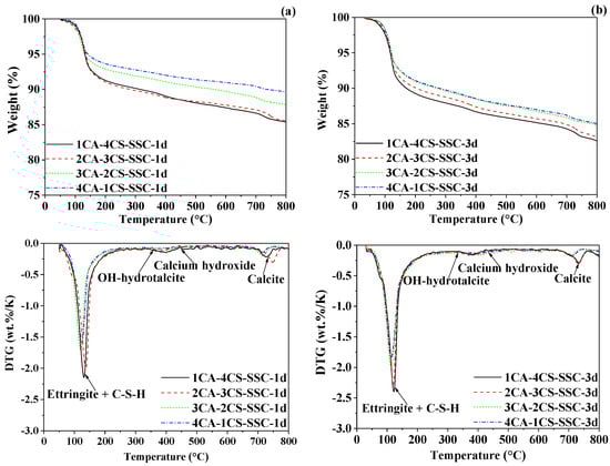 Quantitative XRD results confirmed that at 1 day of hydration, the 1CA-4CS-SSC paste exhibited a greater amount of ettringite formation compared to the 2CA-3CS-SSC, 3CA-2CS-SSC, and 4CA-1CS-SSC pastes, reaching 18.99%. From 1 to 3 days of hydration, the amount of ettringite formed in the 1CA-4CS-SSC, 2CA-3CS-SSC, 3CA-2CS-SSC, and 4CA-1CS-SSC pastes increased by 23.59%, 22.36%, 20.71%, and 20.20%, respectively, indicating a rapid growth trend in ettringite formation. This growth trend reflected the formation of ettringite facilitated by the hydration of slag with anhydrite. As the content of anhydrite gradually decreased, the growth rate of ettringite formation decreased. By 28 days of hydration, the amount of ettringite formed in the 1CA-4CS-SSC paste showed the highest value compared to the 2CA-3CS-SSC, 3CA-2CS-SSC, and 4CA-1CS-SSC pastes, at 26.38%. However, from 28 to 90 days of hydration, the main hydration products in the 1CA-4CS-SSC, 2CA-3CS-SSC, 3CA-2CS-SSC, and 4CA-1CS-SSC pastes gradually became amorphous hydration products (mainly C-S-H, OH-hydrotalcite, and Al(OH)3(am)), and their formation quantities progressively increased, with the amorphous hydration products increasing by 12.15%, 16.27%, 13.40%, and 18.23%, respectively. From 90 to 180 days of hydration, as the anhydrite was consumed, the growth rate of ettringite formation in all pastes decreased, with the amount of ettringite formation in the 1CA-4CS-SSC, 2CA-3CS-SSC, 3CA-2CS-SSC, and 4CA-1CS-SSC pastes only increasing by 1.20%, 1.96%, 3.17%, and 6.10%, respectively, but the amount of amorphous hydration products increased by 11.97%, 7.02%, 8.84%, and 10.37%, respectively. TGA results also confirmed that, after 28 days of hydration, the main hydration products in the CA-CS-SSC system pastes gradually transitioned from ettringite to amorphous hydration products, significantly increasing the amount of C-S-H. No characteristic peak of Ca(OH)2 was discerned in the XRD pattern of the CA-CS-SSC system pastes after 90 days of hydration, suggesting a complete reaction of Ca(OH)2. Given that amorphous phases like the C-S-H, OH-hydrotalcite, and Al(OH)3(am) could not be analyzed via XRD, they were characterized via TGA.