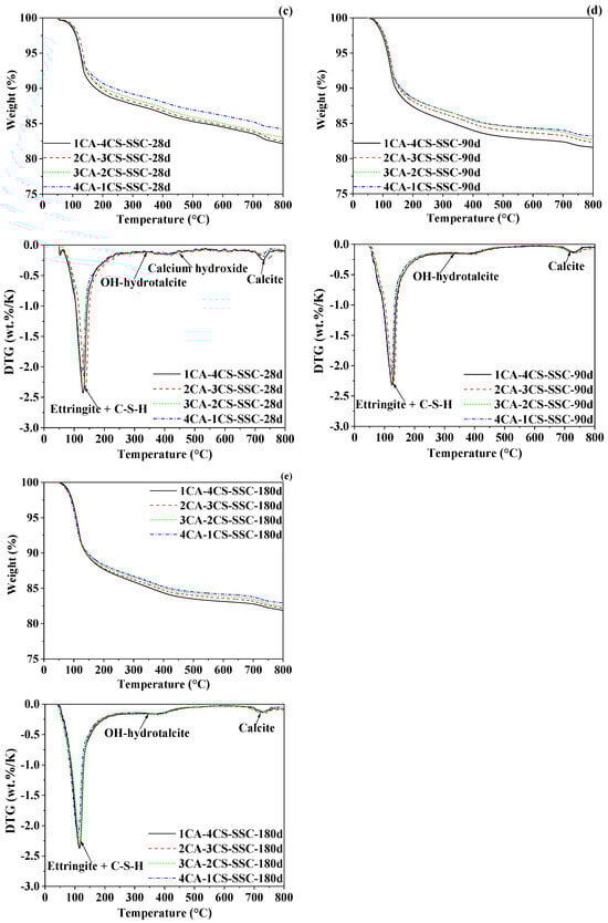 Figure 8. TGA and DTG curves of the CA-CS-SSC system pastes at (a) 1 day, (b) 3 days, (c) 28 days, (d) 90 days, and (e) 180 days.