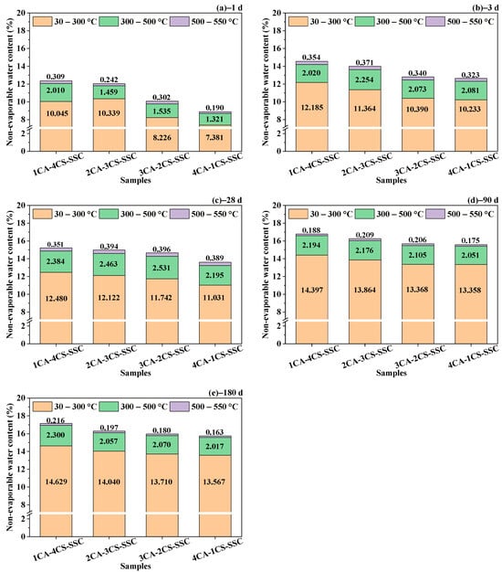 Figure 9. Non-evaporative water content (30–600 °C) of the CA-CS-SSC system pastes at (a) 1 day, (b) 3 days, (c) 28 days, (d) 90 days, and (e) 180 days.