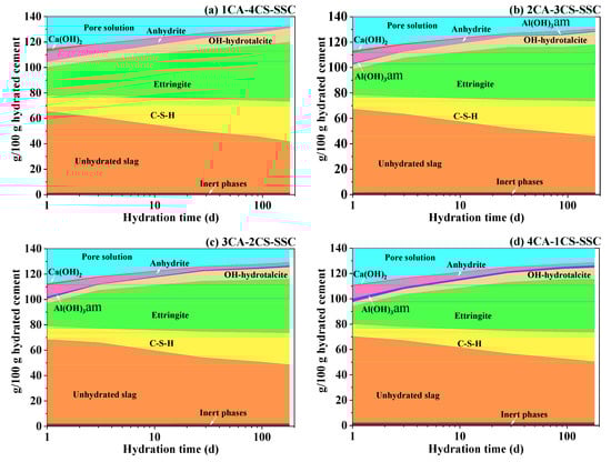 Figure 10. Modeled changes of phase messes of (a) 1CA-4CS-SSC paste, (b) 2CA-3CS-SSC paste, (c) 3CA-2CS-SSC paste, and (d) 4CA-1CS-SSC paste for up to 180 days.