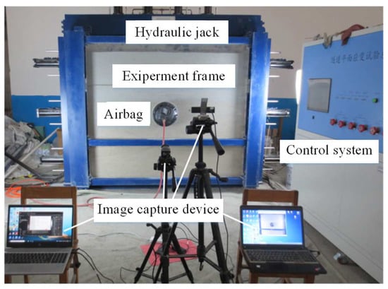 The whole test system includes a tunnel plane strain test system, airbag unloading system, and image monitoring system, as shown in Figure 1. The inner chamber of the test frame is 1.8 m × 0.3 m × 2.0 m (length × width × height), and the front wall of the test frame is a 3 cm thick plexiglass plate, which is convenient for observing the gradual collapse process of the stratum during the test. A hole with a diameter of 30 cm was reserved on the front side of the Plexiglas plate, and the airbag was placed in the middle position. The surface of the inner steel plate was covered with smooth tin foil to minimize the influence of boundary effects. The airbag was connected to the air compressor through a pressure valve, and the pressure value inside the airbag was regulated through the pressure valve. After the model box was filled, the pressure was gradually released through the pressure valve to simulate the stress release process during tunnel excavation.