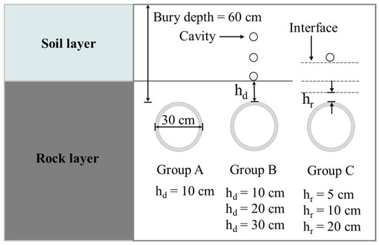 According to the geological exploration data of Qingdao subway, the buried depth of the study tunnel is between 11.5 m and 12.8 m, and the thickness of hard rock above the tunnel roof is between 0.3 and 3.8 m; therefore, the buried depth of the test tunnel is 60 cm, and the diameter (D) is 30 cm, which corresponds to the prototype tunnel with a diameter of 6 m and a buried depth of 12 m. The main purpose of this test was to study the influence of void location and overburdened rock thickness on the collapse of the tunnel, to simplify the tunnel surrounding rock into two homogeneous materials, the soil layer and rock layer, and to simplify the tunnel section into a circle, and the specific test scheme is shown in Table 3. During the model testing process, the thickness of the rock layer was increased to achieve the desired simulation changes after each condition was completed, as shown in Figure 2.