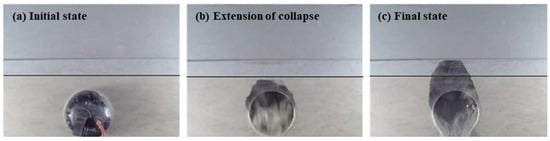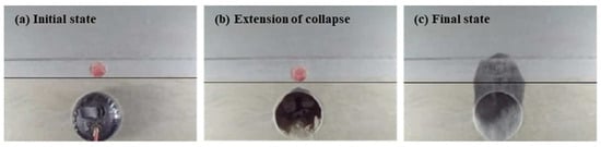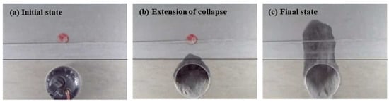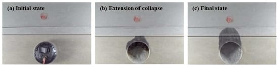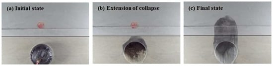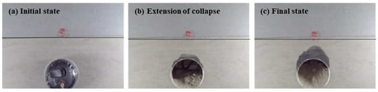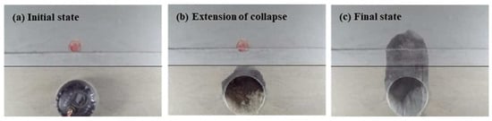 The test results show that the collapse height is the highest in Case 5, so it is further analyzed as a typical case, as shown in Figure 18. The failure of the strata is progressive and the shape of the arch is also different. The shape of collapsing arches has been an interesting subject of study in the past [,]. It has been established in the literature that curved arches initially form when the trapdoor translation is minimal. Then, as the trapdoor translation increases, the arch evolves into a triangular curved arch, a triangular arch, and finally a rectangular shape []. In this experiment, the collapse first appeared in the rock layer and a temporary triangular arch structure was formed, as shown in Figure 18a. Vertically extending cracks appeared as the cavity deteriorated the stratigraphic conditions. A second collapse occurred when the fracture surfaces in the strata were connected. In this stage, the collapse interface developed to the sides and the collapse was more extensive. Then a collapsed arch with a combination of rectangular and curved shapes was formed. The final collapse height was enlarged by about 105% from the first one. Based on the above results, the forms of failure can be summarized into two types [,,]: