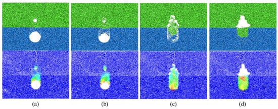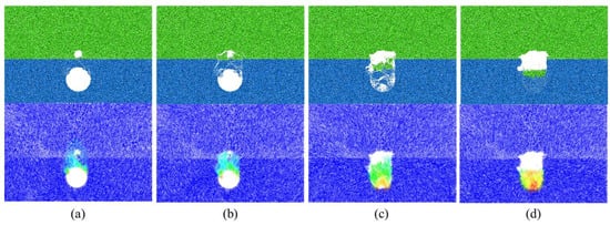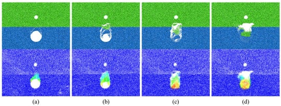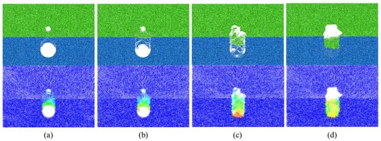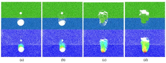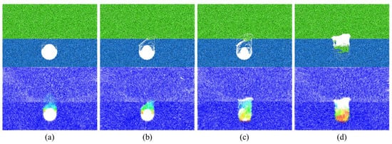 As shown in Figure 7, the collapse started in the rock layer and then reached the soil layer when hr = 5 cm. When the collapse reached the location of the cavity, the collapse developed upward rapidly and finally formed a stable collapsed arch with a height of 39.1 cm, that is, 1.3 D, which was greater than the height of the final state collapsed arch in Scenario 3 (Figure 8). When hr = 20 cm (Figure 9), the top of the arch and the shoulder of the arch first collapsed and then developed upwards to form an arch. A stable collapsed arch was formed in the rock layer. The collapse did not continue because the top of the collapsed arch did not develop to the soil–rock separation interface. The final height of the collapsed arch was 13.2 cm, which corresponds to 0.44 D.