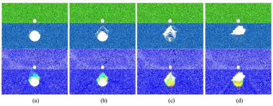 The failure process of composite strata in Scheme G ((a–d) represent 2000, 4000, and 10,000 calculation cycle states and the final relative equilibrium state, respectively).
