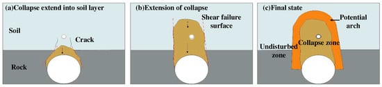 The construction of the subway brings great convenience to public travel [,,,]; however, affected by geological conditions, ground defects, improper construction operation, and other factors, subway construction-induced ground destabilization and collapse accidents also occur frequently [,,]. It has been found that ground cavities are an important cause of tunnel collapse accidents [,,,,]. In the construction of subways in cities such as Beijing and Chengdu, geological strata containing cavities are encountered. For the detection of cavities, scholars have conducted extensive research utilizing radar detection technology [,]. Kravitz et al. [] used ground-penetrating radar to detect cavities, determining the most appropriate antenna frequency that can penetrate through the steel-reinforced segments and produce the best resolution. Despite continual improvements in detection techniques, comprehensive investigation of these cavities remains challenging due to their inherent concealment [,], and collapse caused by construction often happens. To address the above issues, it is necessary to investigate the failure mechanism of strata with a cavity.