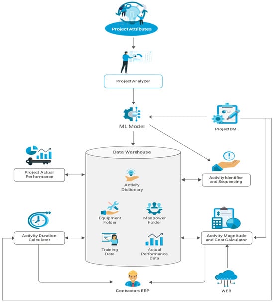 All training data (drawings and files from BIM), with their developed schedules, should be uploaded to the training data repository. In addition, schedules developed by the system and the actual project’s progress after project execution should be retained in the training data repository and used as training data to improve the future system’s performance. For each completed project, a record of the estimated resources, costs, and duration of each activity compared to the actual duration and cost after completion should be stored under the actual performance data for analysis and further model training.