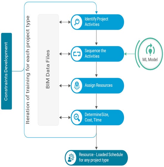 A project schedule that indicates the tasks, due dates, expenses, and available resources is a resource-loaded schedule. Generating such a schedule requires identifying and sequencing project activities, assigning resources, and determining the project size, cost, and duration. A BIM-based framework for creating schedules based on a set of sequencing principles can be implemented using a five-phase method []: (1) construction of the BIM, (2) parsing of the BIM data, (3) transforming the parsed data into activity data, (4) generating a schedule, and (5) refinement of the schedule. The proposed solution would employ BIM data files to determine scheduled activities. Unlike other solutions, the proposed solution would sequence activities based on an ML model rather than constraint matrices [,]. Accordingly, separate iterations of training should be conducted for each type of project (e.g., multi-story buildings or roads) to improve the performance of the system. Ultimately, the solution should be able to generate a resource-loaded schedule for any construction project type after training.