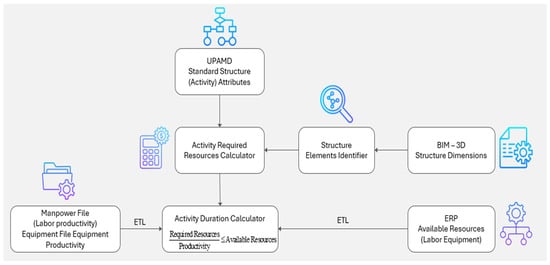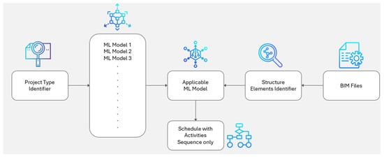 The components mentioned can interact through different methods; for instance, the project analyzer can communicate with the scheduling model via remote procedure calls (RPCs) to determine the project type. After the project type is identified, the applicable ML model will be selected. The BIM files can be transmitted to the system through application programming interfaces (APIs) or as extract, transform, and load (ETL) processes. Subsequently, the ML model will retrieve data from the BIM, activity dictionary, labor folder, and equipment folder, using Shared Memory to generate the schedule. Figure 2 illustrates the process of generating the resource-loaded schedule.
