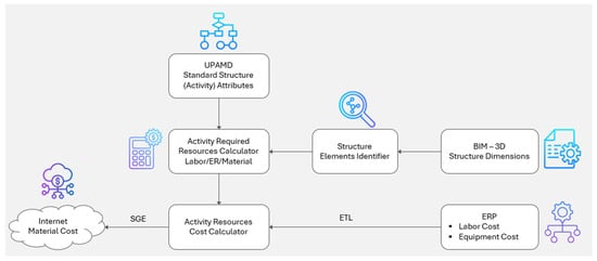Banihashemi et al. [] proposed a framework to integrate a cost estimation standard with BIM. Since each structural element is treated as an activity, the dimensions of the elements are retained in the BIM database (UPAMD). Accordingly, the magnitude of the work of each activity can be determined. This should be fed to the activity magnitude field in the project activity file (Field 6 in Table 4). From the element size, the material quantity, staff requirements, and equipment can be determined. Since worker productivity for each unit of measurement is one of the variables in the activity file (Field 9 in Table 1), the required hours for each activity and equipment hours (Filed 10 in Table 1) could be estimated. Likewise, the necessary quantity of material could be determined by dividing the magnitude of the required material per unit (Field 11 in Table 1). The total activity cost could then be estimated by multiplying the resources with the updated actual cost of materials, staff, and equipment. The material costs could be retrieved directly from the Web using an AI-powered search engine, while the costs of equipment and workers could be sourced from the contractor’s ERP system. The estimated total direct project cost could be determined by aggregating the direct costs of all activities. Initially, for the sake of calculating a project’s direct cost, resource constraints could be ignored. The indirect cost is a function of the project duration, which could be determined once the project duration is set. Figure 4 shows a schematic for the activity cost calculator.
