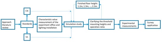 The selected office has dimensions of 4.9 × 4.6 × 2.8 m and is located in the Energy Institute of Istanbul Technical University on the Ayazaga Campus, Maslak, Istanbul, Turkey, with a geographic location of 41°06′27.7″ N 29°01′50.9″ E. The lighting target was set at a working plane height of 0.8 m from the floor. The reflectance values for the office were measured as follows with a luminance meter: 40% for the floor, 90% for the walls, 90% for the ceiling, 2.5% for chairs, and 86% for desks and drawers [26]. These values were used as inputs for simulation studies as well. Figure 1 shows a diagram of the study procedure. By conducting simulations, valuable insights were gained that informed the next steps of the project. The simulations helped in understanding the impact of varying mounting heights on the requested standards and provided a basis for experimental testing. In the results section of this research of the approach, it was observed that by adjusting the height of the luminaires to an optimal level, the required illuminance levels for both energy saving and the optimal suspended height of light were achieved. This allowed for the implementation of dimming strategies to conserve energy without compromising lighting quality. To enhance the understanding of this study’s outline, a schematic diagram is provided in Figure 1.