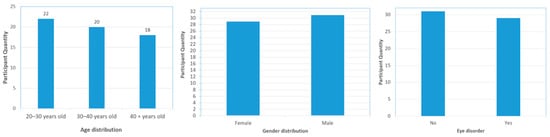 This comprehensive study aimed to thoroughly investigate the impact of lighting conditions on occupants’ cognitive performance, visual perception, and subjective experiences within an office setting. The deliberate variations in luminaire heights and the consideration of participant demographics contribute to the robustness of this study’s findings. At the beginning of this study, demographic information about the participants was collected (See Appendix A, Figure A1), including age, gender, eye disorders, and whether they wore eyeglasses or contacts while working. The results regarding this information are presented in Figure 4.