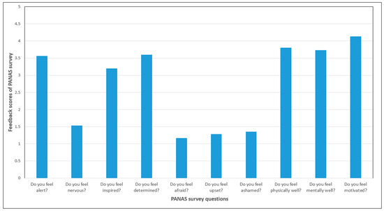 Furthermore, the effect on participants was assessed using the short form of the Positive and Negative Affect Schedule (PANAS) [34]. The 10 items of the PANAS short form were presented in a random order. Additionally, three additional questions were included to measure participants’ current mood, physical well-being, and motivation to complete their ongoing tasks [35]. The PANAS survey was provided at the beginning of the tests, and the results are shown in Figure 7.