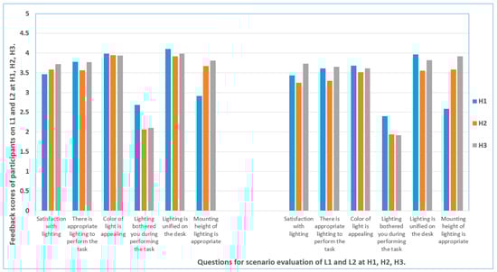 The lighting satisfaction survey was conducted at the conclusion of each set of luminaires. Participants were asked to indicate their level of satisfaction by responding to the following statements: “I am satisfied with the lighting”, “There is an appropriate level of illumination for the task I am currently performing”, “The color of the light is pleasant”, “The lighting is unified on the desk”, and “The height of lighting is pleasant”. Additionally, they were requested to rate the lighting on a scale ranging from Uncomfortable to Comfortable, Not Uniform to Uniform, and Unsuitable to Suitable, taking into consideration the luminaire height. Figure 8 presents the comparative satisfaction results among H1, H2, and H3 for L1 and L2 (see Appendix C, Figure A4).
