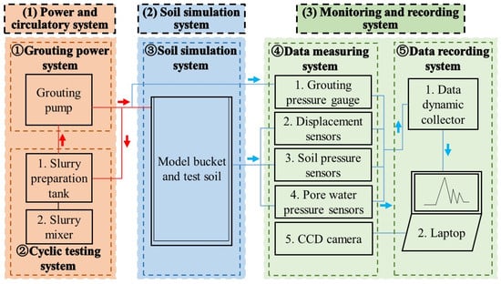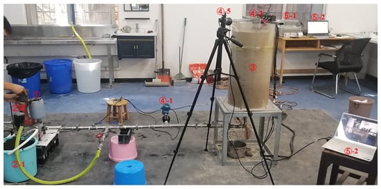 The power circulatory system and soil simulation system were connected by pipelines, and the power circulatory system and soil simulation system were connected to the data measuring system by data lines. The final whole setup is depicted in Figure 3. Since the test soil was a sandy soil layer, the loose characteristics of the soil could not guarantee the normal grouting test process from top to bottom, so the slurry injection position was set at the bottom of the bucket. The grouting pipe with an inner diameter of 20 mm was connected to the bottom of the bucket, and the bottom-up slurry-injection method was adopted to carry out the grouting test.