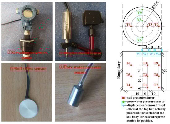 Since a relatively low pore water pressure was measured during the experiments, its impact on the testing process was minimal. Therefore, an analysis of the soil pressure within the soil was conducted, and the arrangement of sensors is depicted in Figure 2.