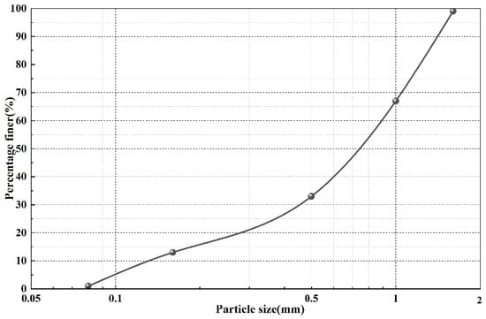 Sandy soil layers were selected as the research subject. To control the properties of the soil to be grouted, standard sand was used for the test. The particle size distribution of the standard sand is displayed in Figure 4, with a uniformity coefficient (Cu) of 6.92 and a curvature coefficient (Cc) of 1.97, which indicated that it was fine sand with good grading. The specific gravity (Gs) of the sand was 2.635 g/cm3, and its water content was mixed to 6%. To ensure the relative uniformity of the soil, a specific mass of sand was loaded into buckets in layers and compacted to 50 mm per layer to control its density to 1.65 g/cm³ and porosity to 0.693. The surface of each layer was roughened before adding the next layer, increasing the surface roughness and bonding between layers until the final height was 650 mm. Geotechnical tests indicated that the cohesive strength (c) of the prepared experimental sand was approximately 10 kPa and the internal friction angle (φ) was approximately 38°.