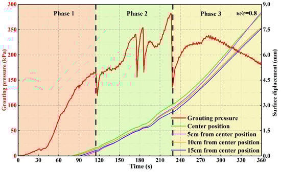 Time-dependent curves of grouting pressure and displacement at a w/c ratio of 0.8.