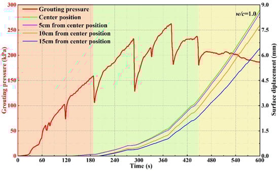 Time-dependent curves of grouting pressure and displacement at a w/c ratio of 1.0.