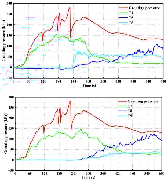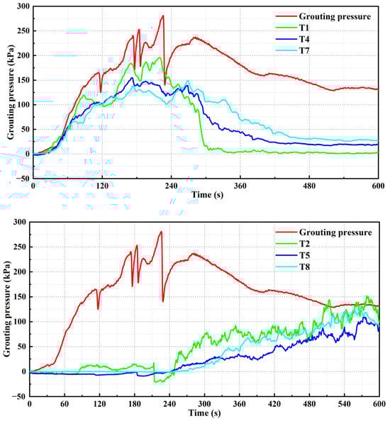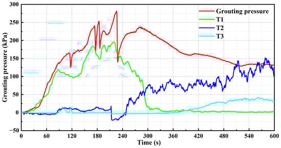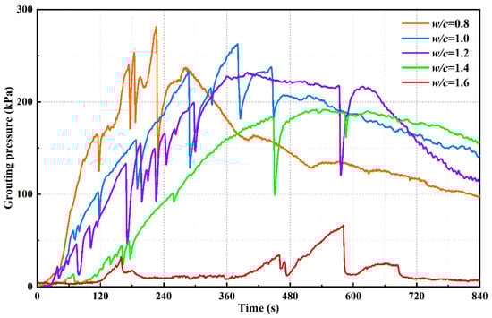 A comparison of the grouting pressure curves at different w/c ratios is plotted in Figure 11, which shows that there were certain similarities and differences in the overall grouting pressure–time curves.