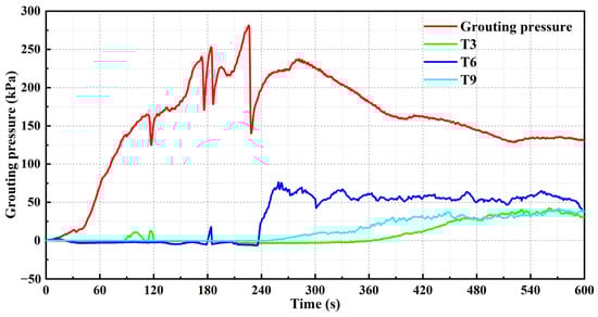 - With the advancement of grouting time, the farther away from the central grouting hole, the more pronounced the lag effect of soil pressure generated by the action of the slurry, and the larger the radius of the action of the grout on the soil. The overall soil pressures exhibited a diminishing trend with increasing distance from the grouting hole.