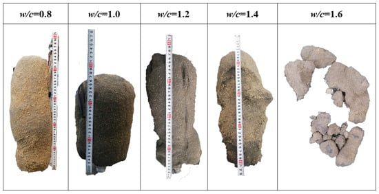 It can be seen from Figure 9 that the overall homogeneity of the solidified body was poorer with the increase in the w/c ratio. This indicated that the higher the w/c ratio of the grout, the more unevenly the grout was stressed within the sandy soil during the grouting process. Furthermore, when the w/c ratio reached 1.6, a completely solidified body cannot be formed during the grouting process.