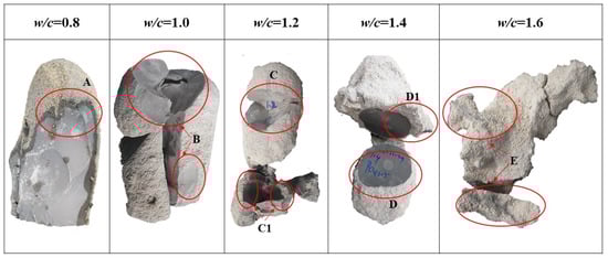As can be seen from the overall situation of the solidified body and the profiles at A and B presented in Figure 9 and Figure 10, when the w/c ratios were 0.8 and 1.0, the solidified body was relatively uniform and mainly consisted of the pure grout, with no significant sand–grout mixture layer on the outer surface. In the case of w/c ratio = 1.2, a small portion of the sand–grout mixture layer with a certain thickness appeared near the grouting hole at location C1, indicating the occurrence of penetration during grouting. However, it is clear from cross-section C that the pure grout was still the primary component of the solidified body. In the case of a w/c ratio of 1.4, the thickness of the sand–grout mixture at location D1 increased significantly, but cross-section D still showed a predominantly pure grout solidified body. This indicated a significant penetration effect during grouting, suggesting a change in the primary interaction mode from a fracture–compaction pattern to a permeation–fracture–compaction pattern. When the w/c ratio increased to 1.6, the solidified body failed to form a complete solid in the soil. It is evident from cross-section E that the sand–grout mixture became the main component of the solidified body, which indicated that permeation played a major role in the grouting process. Pure grout constituted a smaller portion of the solidified body and appeared in the form of grout veins within the solidified body, with a thickness of approximately 3–5 mm. These grout veins primarily developed radially, indicating that the permeation process during grouting was accompanied by a fracturing process.