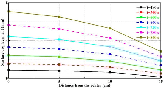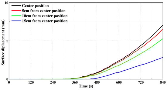 Figure 12, Figure 13, Figure 14 and Figure 15 are plotted based on the surface displacements recorded during the tests. As shown in Figure 12 and Figure 13, in the same test, the surface displacement value exhibited a pattern of decreasing from the center of the grouting hole to the surrounding edge, i.e., the farther the horizontal distance (D) from the center of the grouting hole, the smaller the surface displacement value. Meanwhile, with the increase in grouting time, the uplifting speed of the surface displacement value was faster. And the farther the horizontal distance (D) from the center of the grouting hole, the slower the uplifting speed of the surface displacement value.