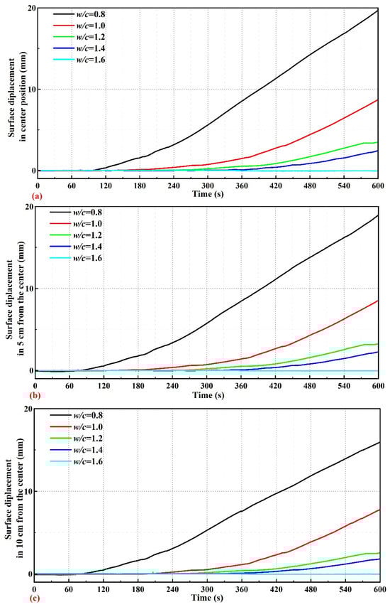Variation curves of surface displacement with time at the same locations from the center under different w/c ratios (a–d).