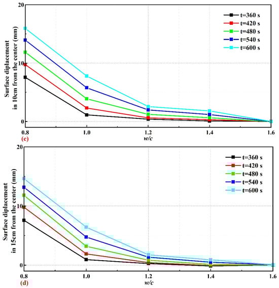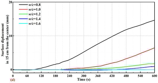 Variation curves of surface displacement with w/c ratios at the same location (a–d).