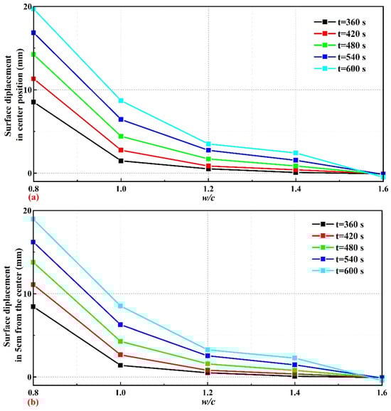 As depicted in Figure 14 and Figure 15, in experiments with different w/c ratios, an increase in the w/c ratio led to smaller uplift displacement values at the same location on the ground’s surface within the same time period. In addition, the rate of increase in uplift values was slower, and the initiation of uplift displacement occurred later. Similarly, a longer grouting time and a larger volume of grout were required to achieve the same uplift displacement value. It can be seen from Figure 15 that the surface displacement value at the same position exhibited the maximum variation when the w/c ratio ranged from 0.8 to 1.0 during the same grouting time. As the w/c ratio exceeded 1.0, the changing trend of the surface displacement value slowed down obviously and became slower with the increasing w/c ratio, i.e., the decreasing change trend with the increase of w/c ratio slowed down with the w/c ratio increasing in the same grouting time. The reason for this is consistent with Section 4.1 above, and is related to the transition in the interaction mode between the grout and the sandy soil. The increase in the w/c ratio led to the occurrence of infiltration during grouting process in sandy soil, and the infiltration effect is more obvious in higher w/c ratio. Consequently, the effect of the grout on the skeleton structure in sandy soil mass decreases, leading to smaller deformations within the soil and, hence, smaller uplift displacement values at the ground’s surface.