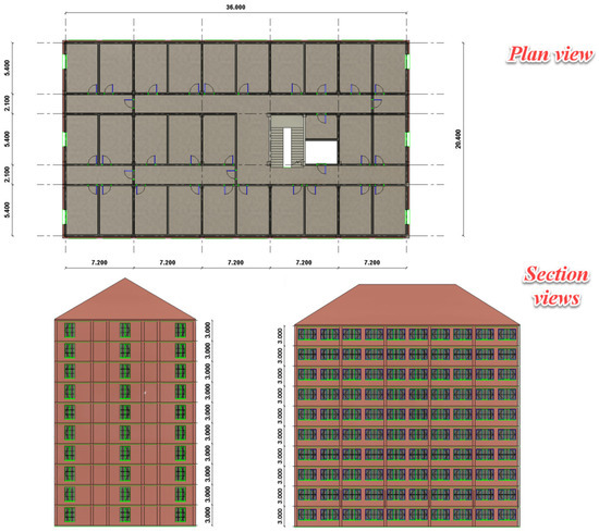 To design, develop, and display a three-dimensional virtual model of a ten-story dormitory structure, Autodesk Revit was selected as the technology for this work. One building was designed using Revit software, incorporating different concrete compositions: standard concrete, concrete with 70% recycled aggregate, and concrete with 30% recycled aggregate. Figure 2 shows the 3D and plan views of the architectural model using Autodesk Revit. The above-established methodology was applied to these designed concrete buildings, resulting in results that met the predetermined standard [25]. Revit was selected primarily for its ability to generate drawings and models that highlight the fundamental principles of BIM. Subsequently, the concrete and reinforcement constitution of structural components from structural design using the AxisVM program were applied. This specific software was used for the examination of RC elements, providing information on individual volumes of concrete and reinforcement. The obtained volume data serve as a crucial parameter for analyzing the CO2 emissions associated with the structural elements of the building under consideration.