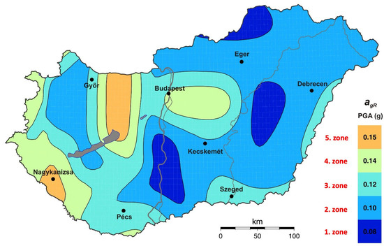 Seismic hazard map used in Hungary to determine peak ground acceleration [26].