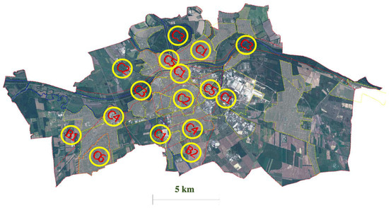 In addition to site seismicity, another crucial parameter to address in the design process is the characterization of site soil properties. The site soil properties include six soil types which are classified according to the average shear wave velocity of the site: Type A (>800 m/s), Type B (360–800 m/s), Type C (180–360 m/s), Type D (<180 m/s), and Type E, which includes S1 (<100 m/s) and S2 [27]. The Győr micro zonation map, derived from these investigations, is presented in Figure 4. Upon examination of the figure, it becomes evident that, despite the presence of some locations with B-type soil, the predominant soil type in Győr is classified as C. Cohesive soils classified as Type B are distinguished by their unconfined compressive strength, which is greater than 48 kPa but less than 144 kPa [27]. On the contrary, cohesive soils with an unconfined compressive strength of less than 48 kPa are known as Type C soils [27]. Consequently, for the purposes of this investigation, the design of the building has taken into account the prevailing soil type of C.
