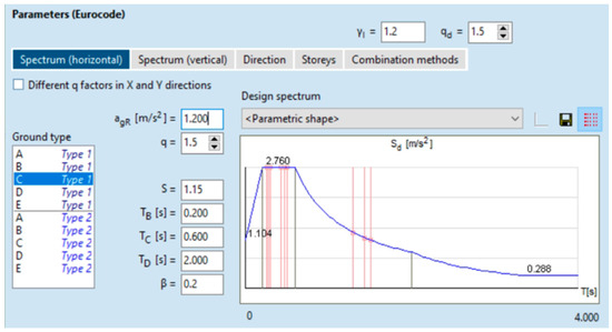 The design response spectrum for the building has been established by integrating the soil properties and PGA of the site. The considered values include agr, which is the ground acceleration, set at 1.2 m/s2, the soil type designated as C, and an assigned building importance factor of 1.2, per Eurocode 8 [27]. The vertical red lines in the design response spectrum correspond to the periods of different modes, as shown in Figure 5.