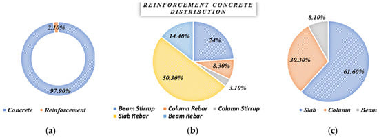 The construction project involved the utilization of over 4296 tons of concrete and 90 tons of steel. The distribution of materials, encompassing both concrete and reinforcement, is illustrated in Figure 6. Figure 6a demonstrates that 61.6% of total concrete was allocated to slabs, 30.3% to columns, and 8.1% to beams. Figure 6b indicates that 50.4% of the total reinforcement was designated for slab reinforcement, 24% for beam stirrups, 14.4% for beam rebars, 8.3% for column rebars, and 3.1% for column stirrups. Figure 6c represents that 97.9% of the total material employed in the building’s design is concrete, with the remaining 2.1% constituting the reinforcement.