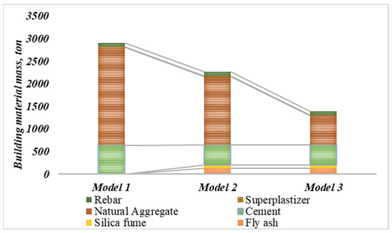 The volume consumption of carbon emissions was the only environmental criterion considered to assess the environmental performance of studied models constructed from RC buildings. As mentioned above, cement is the main component that produced the huge amount of CO2 emissions, which varied from one building to another, as fly ash and silica fume were used in place of cement in our study. Furthermore, the natural aggregate was deemed to be a competent variable, as it changed based on the ratio of a recycled concrete aggregate, and superplasticizer was found to be more competent as the ratio of the recycled concrete aggregate increased. Table 1 shows the percentage of the cement, natural aggregate, and superplasticizer needed for each designed model.