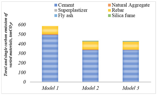 By utilizing the previously mentioned Equation (1) for computations, Model 1 revealed an overall carbon emission of 586.138 tons of CO2. Model 2 states that a total of 426.907 tons of CO2 was released. In contrast, model 3 displayed the value of 424.5511 tons of CO2 as total carbon emissions. The study covers carbon emissions from construction to end-of-life, with an expected 50-year lifetime. The raw material stage exhibits the highest carbon emissions in Model 1. However, Model 2 ranks as the second highest in carbon emissions compared to standard concrete. Detailed comparisons of embodied carbon emissions (in tons CO2e) and the mass of materials from the three design model options, considering both virgin and supplementary cementitious materials, are presented in Figure 8. Notably, incorporating a high dose of recycled concrete aggregate (up to 70%) results in a 27.5% reduction in carbon emissions compared to standard concrete, representing that low carbon dioxide reductions are attributed to the substitution of natural aggregates.