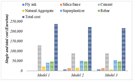 For the purpose of coordinating and using the cost analysis approach, several rules and regulations have recently been developed [30]. Still, there is no specific approach for figuring out expenses in the construction field. But it only provides a financial view of a product’s life cycle, while the life cycle provides ecological details on emissions that contribute to climate change and pollution. However, to complete the cost analysis and provide a basis for the calculations, the viewpoint integrated by one or more of the stakeholders participating in the product life cycle must be fixed. In our work, the cost of recycled coarse aggregate (no transportation) was produced in our laboratory, and the cost was 0.004 euro/kg. Meanwhile, cement, coarse/fine aggregate, fly ash, silica fume, superplasticizer, and rebar were 0.2 euro/kg, 0.01 Euro/kg, 0.172 Euro/kg, 0.06 Euro/kg, 5.25 Euro/kg, and 0.22 Euro/kg, respectively. The international wholesale price (https://Alibaba.com) and applicable transportation expenses are the basis for all materials used. According to the suppliers, the total cost of each concrete mixture (excluding transportation expenses) was calculated by combining the prices of each component required to manufacture one cubic meter of concrete. Additionally, the transportation cost was 6.3 Euro/20 km.