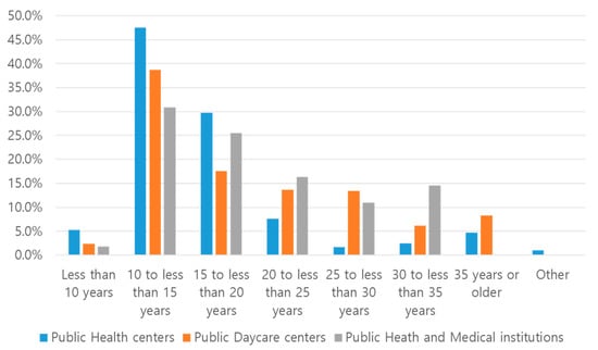 According to the analysis of building aging by use (Figure 2), health centers, daycare centers, and medical institutions all showed the highest distribution of buildings that are 10 to less than 15 years old. Among these, health centers had the highest proportion at 47.55%, followed by daycare centers at 38.65%, and medical institutions at 30.91%. Next, the proportion of buildings that are 15 to less than 20 years old was high, with health centers at 29.8%, daycare centers at 17.5%, and medical institutions at 25.45%. For health centers, the percentage of buildings up to 20 years old was less than 10%, showing a substantial difference in distribution compared to buildings under 20 years old. Daycare centers showed a similar distribution, with 13.65% of buildings being 20 years old or older and less than 15 years old and 13.46% of buildings being 25 or less than 30 years old. The age of medical institutions was evenly distributed from 20 years to less 35 years old, with no buildings 35 years old or older.