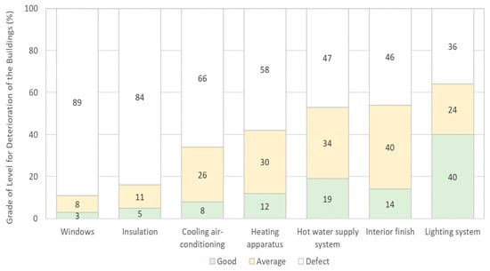 In descending order, the building conditions with poor ratings were as follows: windows (89%) > insulation (84%) > cooling equipment (66%) > heating equipment (58%) > hot water supply equipment (47%) > interior finishing (45%) > lighting equipment (36%). The equipment, such as cooling, heating, and lighting, was in better condition than windows and insulation because their replacement work was easier and cheaper than construction work involving windows and insulation, which required installing scaffolding and relocating users. Therefore, some improvements had already been made.