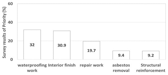 Moreover, according to the results for additional construction items that do not affect energy performance but are necessary for building use such as maintenance and repair (Figure 4), waterproofing showed the highest priority; thus, green remodeling design consulting that reflected this result was performed.
