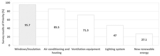 According to the building aging assessment and questionnaire survey results, windows and insulation showed the highest priority for energy performance improvement through green remodeling at 95.7%. Regarding the other design priorities for green remodeling, this was followed by heating and cooling equipment, ventilation equipment, lighting equipment, and renewable energy equipment.